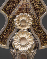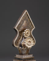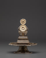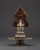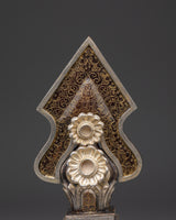 This magnificent Tibetan Ritual Torma is a stunning, handcrafted item featuring oxidized copper and silver plating, which will add spiritual depth to any Buddhist shrine or altar. Its complex and intricate design makes it a practical gift for Buddhist rituals and meditation activities. Its unique combination of materials classifies it as both a spiritual instrument and a lovely decorative object. Whether you use it to enhance your meditation experience or as part of a religious ritual, this Torma holds great cultural and spiritual significance.