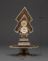 This Tibetan Torma, which stands 20 cm tall and weighs 0.45 kg, is both lightweight and compact, yet it carries a rich symbolic meaning in Tibetan Buddhism. Each piece is meticulously made to showcase the esteem and dedication of Tibetan artists, resulting in a genuinely unique addition to your collection. The oxidized copper body provides a natural appearance, while the silver plating offers an exquisite finish. Place it on your Buddhist shrine or altar to enhance your spiritual space and generate a sense of calm and mindfulness in your house.