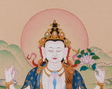 A Chenrezig, the Bodhisattva of Compassion, seated in a vajra posture on a lotus seat with a moon disc, adorned with a five-jeweled crown, and holding symbolic items like a crystal rosary and a lotus. The painting is a powerful spiritual tool, inviting compassion, peace, and mindfulness into your sacred space. Perfect for meditation, altar decoration, or as a meaningful gift, this traditional Tibetan Buddhist painting embodies centuries of sacred artistry and devotion.