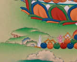 This 13-inch Chenrezig is a traditional Tibetan Buddhist thangka, hand-painted on cotton canvas using 24K gold and natural stone colors. 24K gold highlights sacred elements such as the jeweled crown and halo, creating a radiant divine aura. At the same time, natural stone colors lend vibrant, lasting colors that enhance the spiritual depth of the artwork.