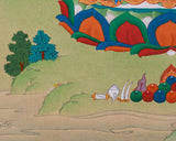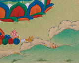 Bhaisajyaguru, known as the Buddha of Healing, is depicted in his traditional pose, holding a medicinal myrobalan plant and a nectar bowl, symbolizing his ability to heal suffering and purify body and mind. His serene, compassionate face in this thangka inspires spiritual healing and purification. The use of gold and vibrant natural colors enriches the sacred atmosphere, making it a potent aid for meditation, healing, and spiritual growth. This painting is a beautiful devotional artifact that would be perfect for your meditation spaces or altars. It brings wonderful blessings of health, longevity, and protection, making it a meaningful addition to your spiritual practice.