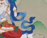 A White Tara Buddha Art is a hand-painted thangka depicting the Bodhisattva of Compassion and Longevity, known for her healing power and ability to grant long life. The artist meticulously creates the thangka using natural stone colors and 24K gold, symbolizing purity and enlightenment. The Karma Gadri style is evident in the intricate details, flowing composition, and gentle use of color.