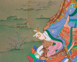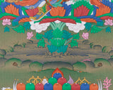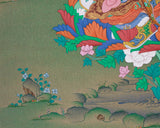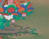 This thangka portrays Guru Rinpoche, also called Padmasambhava, in a tranquil pose amid lush greenery. He sits in the lotus position, representing his enlightenment and mastery over the physical and spiritual worlds. His calm, wise, and compassionate presence conveys a deep sense of peace to viewers. In this artwork, Guru Rinpoche holds a vajra—a symbol of unbreakable truth—and a skull cup topped with a vase, symbolizing wisdom's transformative power and ignorance's purification. His katvanga (staff) signifies his power to overcome obstacles. The background, full of vibrant greenery, enhances the peaceful natural setting and the spiritual atmosphere.