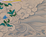 This divine Red Tara artwork is a hand-painted thangka on cotton canvas, using natural stone colors and 24K gold in the Karma Gadri style. The mineral-based colors provide depth and vibrancy, enriching the visual texture and sanctity of the painting. The 24K gold illuminates Tara's divine presence, gracing her ornaments and sacred elements with a celestial shimmer that reflects light like the essence of awakened wisdom. The traditional Karma Gadri method promotes a feeling of calm and spiritual openness, inviting the viewer into a peaceful, meditative state.