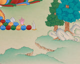 The Karma Gadri style, known for its fine details and clarity, brings Amitayus to life with precision and spiritual depth. Seated on a beautifully adorned lotus pedestal, he bestows the nectar of immortality, symbolizing his power to grant longevity and eliminate barriers to both physical and spiritual well-being. His poised and meditative stance encourages peace and introspection. The offerings surrounding him, jewels, a conch, and a crown, embody core Buddhist principles: purity, wisdom, and spiritual abundance. The flourishing trees and tranquil scenery surrounding Amitayus emphasize the serene environment conducive to the growth of his teachings, imparting a sense of calm and tranquility to the viewer.