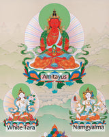 At the center, Amitayus is depicted in serene meditation, holding the vase of immortality, symbolizing his blessings of long life and spiritual vitality. White Tara, revered for her compassion and healing energy, and Namgyalma, the protector against untimely death, beautifully complement Amitayus, enhancing the thangka’s spiritual power.