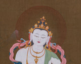 A sacred artwork beautifully depicts Traditional Dorje Sempa, also known as Vajrasattva, the deity of purification and inner transformation. Hand-painted using genuine 24K gold and vibrant acrylic colors on high-quality cotton canvas, this thangka follows the spacious and delicate composition style of traditional Karma Gadri art. Our studio artists have created an original piece that radiates clarity, balance, and peaceful energy. The fine brushwork and shimmering gold details highlight the spiritual essence of the deity with reverence and elegance.