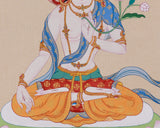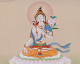 Executed in the traditional Karma Gadri style, this thangka reflects centuries of Tibetan artistic heritage, characterized by precise brushwork and a harmonious blend of colors. The cotton canvas serves as the foundation for this artwork, providing a durable yet elegant backdrop that allows the gold accents to truly shine. The overall composition is thoughtfully arranged, with a minimal, muted background that draws the eye directly to White Tara, making her the focal point of the piece.