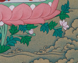 Bring calm and spiritual peace into your space with this vibrant Bhaisajyaguru Buddha Thangka, hand-painted in the traditional Karma Gadri style using natural stone colors and genuine 24K gold. Created from fine cotton canvas, the surface is initially prepared with natural chalk gesso to ensure a smooth, flawless foundation. The natural stone colors, sourced from minerals, precious stones, and botanical elements—give the thangka its rich, earthy tones and spiritual authenticity. Delicate layers of 24K gold highlight Bhaisajyaguru's aura, robe details, and celestial throne, making the artwork shine with divine brilliance and depth. The soft, spacious composition of the Karma Gadri tradition enhances the thangka’s meditative quality, letting the viewer connect deeply with the healing presence of the Medicine Buddha.