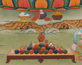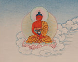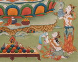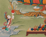 This remarkable thangka depicts Chenrezig with four arms—two joined together in prayer at his heart, holding a wish-fulfilling jewel; the other two have a lotus flower and mala beads, representing purity and ongoing compassion. He sits peacefully on a multi-colored lotus throne, surrounded by a vibrant divine landscape. Above, Amitabha Buddha sits on a lotus cloud, emitting calm and guiding wisdom. Below, Nagkanya, the serpent goddess of protection and fertility, offers a vase of auspicious nectar. At the same time, various sentient beings are depicted with tenderness, reflecting the limitless compassion Chenrezig offers to all realms. Every divine figure, landscape detail, and ritual element is intricately painted in fine lines and luminous tones, creating a spiritual visual journey that uplifts peace and devotion.