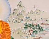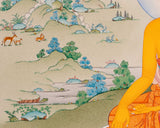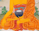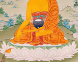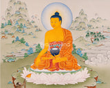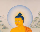 A unique Buddha Shakyamuni thangka painted with natural pigments offers a special artistic representation of the historical Buddha. The use of natural pigments adds a distinctive touch to the thangka, as these pigments are derived from minerals, plants, and other natural sources, giving them a rich and authentic quality.