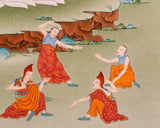 Along with the Shakyamuni, there are four disciples in this thangka where they are depicted as having a debate.