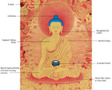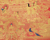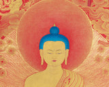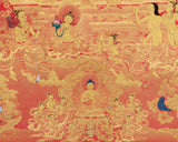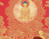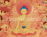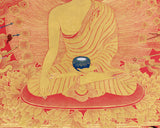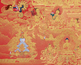 Shakyamuni Buddha's triumph over the Demon Maras is portrayed in this mesmerizing Thangka painting as a moment of transformation and a striking illustration of enlightenment triumphing over material delusions. In traditional Nakthang style, this masterwork, which was expertly hand-painted on cotton canvas, features vivid red acrylic shades that are accentuated with genuine 24K gold embellishments. With Buddha calmly meditating in the middle and Maras representing distractions and temptations all around, the image tells a story of strong spiritual will and fortitude.