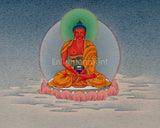 Crafted with unparalleled mastery and devotion by skilled Tibetan artisans, this exquisite thangka transcends traditional boundaries, offering a unique portrayal of Chenresig, the embodiment of boundless compassion, alongside the radiant presence of Buddha Amitabha, the Buddha of Infinite Light.