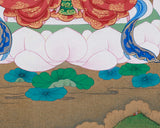 The blend of natural stone pigments and 24K gold elevates the visual appeal and spiritual significance of this Thangka. The stone colors, imported from Tibet, contribute a rich, grounding hue, while the golden highlights brighten Manjushri’s figure, representing his enlightened wisdom and the clarity he offers to practitioners. The detailed artistry of his crown, robes, and halo accentuates his divine attributes, encouraging individuals who meditate on this Thangka to resonate with Manjushri's profound wisdom.