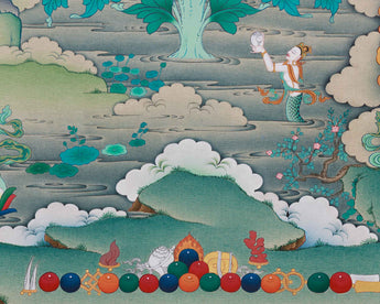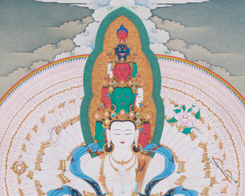 In this beautiful thangka, Avalokiteshvara is depicted in his most majestic and compassionate form—featuring eleven faces and a thousand arms, each extending in a circular halo and holding sacred symbols. Every hand radiates the power to protect, bless, and guide beings toward enlightenment. The central figure stands gracefully on a lotus throne, symbolizing purity amid the chaos of samsara. This artwork captures the divine majesty of Avalokiteshvara, serving as a heartfelt reminder of his eternal vow to help all beings attain liberation from suffering.