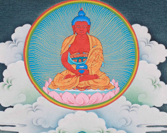 Surrounding Avalokiteshvara are three revered deities—Manjushri, the embodiment of wisdom, seated on the right with his flaming sword of insight; Vajrapani, the powerful guardian of the Dharma, ablaze with protective energy on the left; and Amitabha Buddha, resting serenely above as Avalokiteshvara’s spiritual guide and source of infinite light. Their union represents the harmony of compassion, wisdom, and power—the trinity essential for enlightenment. This triad radiates spiritual energy, symbolizing the perfect balance of heart, mind, and action.