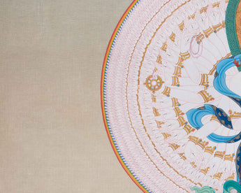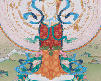 Created with exquisite care in our Enlightenment Studio, this 1000-Armed Avalokiteshvara Art is a hand-painted thangka on fine cotton canvas. It features genuine 24K gold and vivid acrylic colors. Every stroke embodies the divine energy of Avalokiteshvara, the Bodhisattva of Infinite Compassion. The gold accents shine under light, bringing the deity’s thousand arms—symbolizing limitless mercy—vividly to life. The piece maintains the traditional Karma Gadri style, celebrated for its clarity, natural landscapes, and detailed refinement.