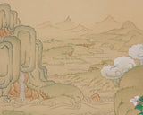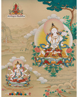 The entire composition is surrounded by a backdrop of hills, blooming flora, soft clouds, and flowing rivers, creating an ethereal sanctuary. The two-toned halos behind each deity symbolize divine energy and purity. Every aspect of this thangka has been carefully considered, making it a profound visual meditation and a meaningful addition to any sacred space. Its symbolism, elegance, and hand-painted precision offer both spiritual and aesthetic significance.