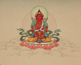 On the upper right side of the thangka, Amitayus Buddha, the Buddha of Infinite Life, is in serene meditation on a lotus throne atop a moon disc. He holds a kalasha, a long-life vase containing immortality's nectar. His rich red hue symbolizes life force, compassion, and longevity. Adorned with a five-jeweled crown, silk garments, and golden ornaments, Amitayus exudes calm strength and wisdom.