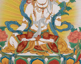 Unlike conventional compositions, this Long Life Bodhisattvas thangka presents White Tara on the left side, seated gracefully on a fully bloomed lotus amidst a serene natural landscape. Her calm expression, seven symbolic eyes, and varada mudra convey protection and compassion. She holds a blue utpala flower, symbolizing purity and enlightenment. At the same time, her form is adorned with fine jewelry, a silk scarf, and a five-jeweled crown, all delicately highlighted with 24K gold to emphasize her divine presence.