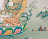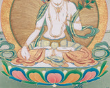 White Tara, as the Goddess of Longevity, is one of the most revered deities in Tibetan Buddhism. Recognized for her compassionate and healing qualities, she is portrayed in this thangka with a serene expression, embodying both resilience and benevolence. The artist has meticulously rendered her with multiple eyes, symbolizing her capacity to perceive and alleviate suffering across all realms. Her lotus throne signifies spiritual enlightenment, while the golden halo encircling her denotes her elevated status as a protector of health and well-being. As a goddess who bestows longevity and peace, Sita Tara's presence in this artwork serves as an invitation to embrace health, prosperity, and divine protection. Through her compassionate gaze, she offers comfort, nurturing those who seek her blessings for a long, vibrant life.