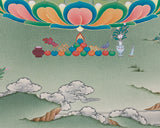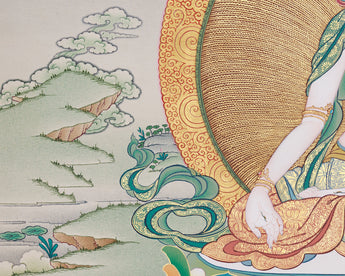 A remarkable portrayal of the Goddess of Longevity, Sita Tara Thangka, captivates observers with its exquisite artistry. Hand-painted with care on high-quality cotton canvas, it features vibrant acrylic colors and genuine 24K gold embellishments. Rendered in the revered Menri style, a traditional Tibetan technique renowned for its precision and spiritual significance, each detail radiates divine beauty. The shimmering gold accents not only enhance its visual splendor but also symbolize purity and enlightenment. Created with expert skill and premium materials, this thangka is a timeless masterpiece that both elevates spiritual practice and preserves its sacred beauty for generations to come.