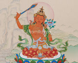 Our Manjushri Buddha artwork is a hand-painted thangka, created with high-quality materials to bring the Bodhisattva of Wisdom to life. The cotton canvas offers a sturdy surface for capturing intricate details and fine brushwork, while natural stone colors from crushed gemstones create vibrant hues. Genuine 24K gold accents highlight the divine features of Manjushri, such as his crown and jewelry, adding an ethereal glow. In the traditional Karma Gadri style, this artwork showcases the sacred geometry, symmetrical balance, and intricate detail that define this revered Tibetan Buddhist tradition.