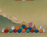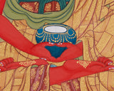 This sacred thangka has deep spiritual meaning with extensive symbolism in its symbolism. Amitabha Buddha is portrayed as radiating deep peace while sitting in a meditative position on a beautiful lotus throne. Holding a monk's bowl delicately in the Dhyana Mudra, his hands represent the sustaining of wisdom and enlightenment. With his traditional monk's robe wrapped around him, he radiates wisdom and humbleness. His feet are marked with a sacred Dharma Wheel, which represents the wheel of Dharma's continuous rotation, which leads all beings to enlightenment. This beautiful thangka is an inspiring focus point for devotion and meditation, and it carries you to an area of spiritual peace.