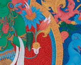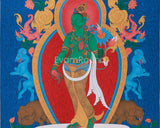 Green Tara, also known as "She Who Saves," is deeply revered in Tibetan Buddhism as the swift liberator from suffering and fear. This thangka depicts Green Tara standing, signifying her readiness to step forward and assist sentient beings without hesitation. Her green color represents active compassion, and she holds a blue lotus (utpala flower), symbolizing purity and spiritual awakening. Encircled by vibrant flora, elephants, and mythical creatures, the painting reinforces her dynamic energy and protective grace.