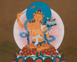 The Enlightened Bodhisattva Manjushri Thangka features a finely hand-painted portrayal of one of the most esteemed Bodhisattvas in Tibetan Buddhism, representing the essence of wisdom. Created in the traditional Karma Gadri style, this piece has been carefully crafted using acrylic paint and real 24K gold, embodying Manjushri's tranquil and transformative energy. This thangka is drawn with precise adherence to the guidelines mentioned in the meditation manual, ensuring its spiritual accuracy and authenticity.