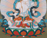 White Tara, a revered goddess of compassion and healing in Tibetan Buddhism, is depicted in this exquisite thangka in a calm yet commanding pose, radiating serenity and strength. Seated in the meditative lotus position (padmasana), she symbolizes balance, peace, and spiritual enlightenment. Her right hand is raised in the Varada mudra, representing blessings, healing, and the alleviation of suffering, while her left hand holds a lotus flower, signifying purity and spiritual awakening. Notably, White Tara is portrayed with seven eyes, on her forehead, two on her palms, and two on her soles, symbolizing her omniscient awareness and deep compassion for all beings. Her posture and gestures emphasize her role as a divine protector, healer, and guide, making her a powerful symbol of longevity, peace, and spiritual growth in Tibetan tradition.