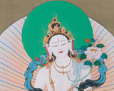 Female Deity Artwork, White Tara showcases delicate details and vibrant colors, capturing the serene and compassionate essence of the goddess. The Thangka is embellished with genuine 24K gold, which is applied to highlight the religious qualities of the goddess, transforming it from a work of art into a spiritual object. Skillfully placed acrylic colors bring out brilliant details and depth, while the cotton canvas provides a robust and textured surface. The use of materials in the Thangka also highlights the elaborate patterns typical of the Karma Gadri style, which is renowned for its delicate brushwork and profound meaning.