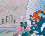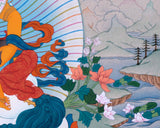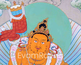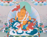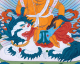 This Five Dzambhala Masterpiece Thangka collectively symbolize the bestowal of wealth, abundance, and prosperity. Each Dzambhala is characterized by a distinct color, encompassing different material and spiritual enrichment aspects. The White Dzambhala, brings purity and purifies negativity. The Yellow Dzambhala, bestows wealth and prevents financial hardships. The Red Dzambhala offers protection and wealth enhancement. The Green Dzambhala, promotes growth and success. The Black Dzambhala, overcomes obstacles and brings auspiciousness. Devotees seek the blessings of these Dzambhalas to improve their financial circumstances and cultivate virtues such as generosity, compassion, and wisdom. The interplay of material like acrylic color and spiritual well-being is acknowledged and embraced in their divine presence.
