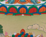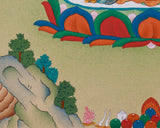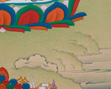 Revered in Tibetan Buddhism as the embodiment of infinite compassion, Chenrezig is depicted with four arms, each representing his limitless ability to assist sentient beings in all directions. The thangka captures his calm expression and iconic symbols, including the lotus flower, prayer beads, and wish-fulfilling crystal. Painted with brushwork and framed by gentle landscapes typical of Karma Gadri, it enhances the spiritual atmosphere and invites meditation. This painting serves as both a devotional image and a meditation tool, inspiring compassion and spiritual growth in all viewers.