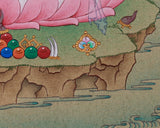 Chenrezig is depicted in a tranquil vajra position atop a moon disc on a lotus base, emanating spiritual majesty and divine serenity. His radiant white body, adorned with flowing silks and a crown featuring five jewels, radiates tranquility and purity. The bodhisattva's commitment to protect all sentient beings and promote non-violence is represented by a delicate deer-skin draped over one shoulder. The Thangka's spiritual significance is further enriched by the intricate decorations on his attire and the halo, symbolizing his deep connection with the universe. The serene mountains and lush landscapes in the background illustrate the extent and calmness of the Buddha's compassion and wisdom. This thangka transcends mere sacred art; it serves as a visual mantra that enhances meditation, emanates loving-kindness, and transforms any space into a sanctuary of serenity.