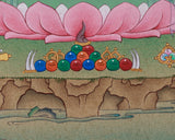 This Four-Armed Chenrezig Thangka illustrates Avalokiteshvara, the Bodhisattva of Compassion, in his most iconic representation, showcasing four arms that signify his boundless ability to rescue all sentient beings. His four-armed form symbolizes the all-encompassing nature of enlightened love, with each arm representing the four immeasurable qualities of joy, serenity, compassion, and loving-kindness. In his principal hands, joined at the heart in the anjali mudra, he holds a wish-fulfilling jewel. His additional hands grasp a blossoming lotus, symbolizing the purity of body, speech, and mind, and a crystal rosary, signifying the continuous cycle of compassionate action. Crafted with genuine 24K gold and natural stone colors, this Thangka presents a timeless and uplifting image. Each detail, executed in the traditional Karma Gadri style, carefully rendered to honor ancient Tibetan craftsmanship and invoke divine blessings.