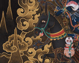 Experience the strength and protection of Four-Armed Palden Lhamo through this hand-painted thangka. Created on high-quality cotton canvas, it comes alive with vibrant acrylic colors and is accented with authentic 24K gold. Painted in the traditional Nakthang (gold on black) style, this technique uses gold leaf over a black background, highlighting Palden Lhamo’s fierce presence. The vivid acrylic colors deepen her expression, while the 24K gold details emphasize sacred symbols, creating a striking visual contrast.