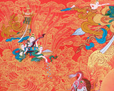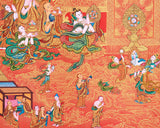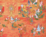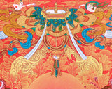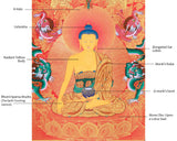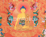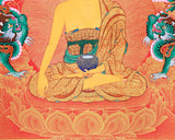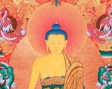 This exquisite Thangka of Gautama Siddhartha Buddha, popularly referred to as the Sage of the Shakyas, is an adored representation of knowledge and enlightenment. Hand-painted in the Nakthang (Gold on Red) manner, this artwork highlights the Buddha's calm figure with authentic 24K gold, creating a brilliant contrast with the deep red background. The Buddha is depicted sitting on a throne surrounded by enlightened beings, representing peace, tranquility, and divine wisdom. The elaborate use of gold highlights the Buddha's spiritual vitality.