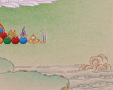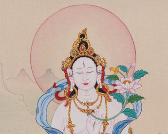 Radiating gentle compassion and timeless beauty, this goddess of longevity white tara thangka is a hand-painted sacred work on cotton canvas, utilizing natural stone colors and embellished with genuine 24K gold. The painting showcases the serene and spacious Karma Gadri style, featuring soft pastel tones, flowing brushstrokes, and an elegant balance of landscape and figure. The natural mineral pigments impart a subtle, luminous quality to the composition, while the gold detailing accentuates her divine ornaments and crown with exquisite clarity. With dimensions of 9" by 13", this smaller thangka is ideal for altar space or personal practice, combining elegant design with a sacred purpose.