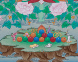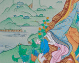 Guru Orgyen Menla, the Healing Guru, regarded as having healing and transformational abilities. Evoking a sense of tranquility and spiritual profundity, the vivid natural stone hues and authentic 24K gold embellishments are displayed on small cotton canvas. A skull cup with a vase on top, a katvanga staff signifying spiritual strength and transformation, and the Guru's calm figure holding a myrobalan plant, a symbol of healing are all included in this sacred artwork, which is crafted in the traditional Karma Gadri style.