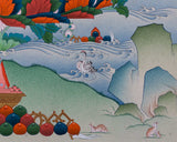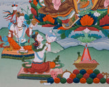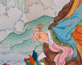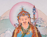 At the center of the Thangka, Guru Rinpoche (Padmasambhava) is portrayed in his characteristic form, seated in a meditative posture, radiating wisdom and spiritual authority. Flanked by his two consorts, Yeshe Tsogyal and Mandarava, Guru Rinpoche embodies the union of wisdom and skillful means, symbolizing the harmony of masculine and feminine energies within the enlightened mind.