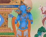 The Amitabha Buddha Thangka offers a tranquil portrayal of boundless compassion and enlightenment. This thangka, carefully painted by hand, captures Amitabha Buddha, the embodiment of Infinite Light and Life, in vibrant natural stone colors heightened by Genuine 24K Gold. Crafted on high-quality cotton canvas, it showcases the refinement and depth characteristic of the Karma Gardi style, known for its intricate details and spiritual significance. The thangka depicts Amitabha Buddha in a serene and benevolent form, evoking a sense of peace and spiritual contemplation. Beyond its aesthetic appeal, this artwork is a testament to Nepalese craftsmanship, infusing spaces with a calming presence and serving as a focal point for meditation on the teachings of Amitabha Buddha. It transcends being merely visually pleasing, emerging as a profound spiritual instrument that facilitates contemplation on enlightenment and the pure land of bliss associated with Amitabha.