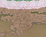 Chenrezig, known as the Bodhisattva of Compassion, is honored in Tibetan Buddhism for his boundless mercy and wisdom. This thangka depicts him with multiple arms, symbolizing his willingness to provide compassion in many forms to all sentient beings. His calm expression and peaceful stance reflect the core of infinite love and compassion. The elegant lotus seat and shimmering gold accents emphasize his purity and spiritual authority. At the same time, the detailed features, such as the crystal rosary and wish-fulfilling jewel, symbolize his dedication to the well-being of all beings. This beautiful thangka is not only a striking piece of art but also a spiritual instrument to evoke peace, wisdom, and compassion in any environment.