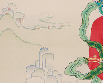 In this thangka, Amitayus Buddha is depicted seated upon a radiant lotus throne, holding a nectar vase in both hands, symbolizing the essence of long life, healing, and spiritual blessings. His serene expression radiates tranquility, while the golden halo and subtle lotus motifs surrounding him amplify his sacred presence. The harmonious background of mountains reflects the expansive and peaceful nature of Amitayus’s blessings.