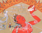 Vajrayogini, a prominent and revered figure in Tibetan Buddhism, embodies the fierce and transformative aspect of the enlightened feminine principle. Often depicted in a wrathful form, she symbolizes the cutting through of illusion and the powerful energy required for spiritual awakening. Vajrayogini is associated with the Chakrasamvara cycle of tantric practices and is considered a principal deity in various Vajrayana traditions. Devotees engage in rituals and meditations dedicated to Vajrayogini to harness her potent energy for the purification of negative karma and the realization of ultimate wisdom. She is often depicted with a katvanga (ritual staff) and a curved knife, signifying the cutting of attachment and the realization of emptiness. Vajrayogini's practice is renowned for its transformative power, guiding practitioners on the path to enlightenment through the embodiment of wisdom, compassion, and fierce compassion.