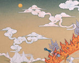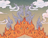 The Tibetan Wrathful Deity Vajrayogini Thangka, a captivating masterpiece, is an awe-inspiring representation of the Divine Feminine meticulously hand-painted on a sumptuous cotton canvas. Executed with natural stone colors, the thangka radiates an earthy vibrancy, capturing the potent energy of Vajrayogini, a fierce and transformative aspect of the enlightened feminine principle. The infusion of genuine 24K gold adds a touch of opulence, casting a luminous glow that symbolizes the divine radiance and transcendent qualities associated with this wrathful deity. Each brushstroke on the canvas reflects the artist's dedication to precision, bringing forth the intricate details of Vajrayogini's fierce yet compassionate presence. This thangka serves as a powerful visual portal to the sacred realm of tantric wisdom, inviting contemplation and connection with the profound teachings and transformative energy embodied by the Divine Feminine in Tibetan Buddhism.