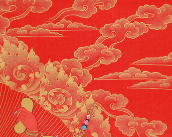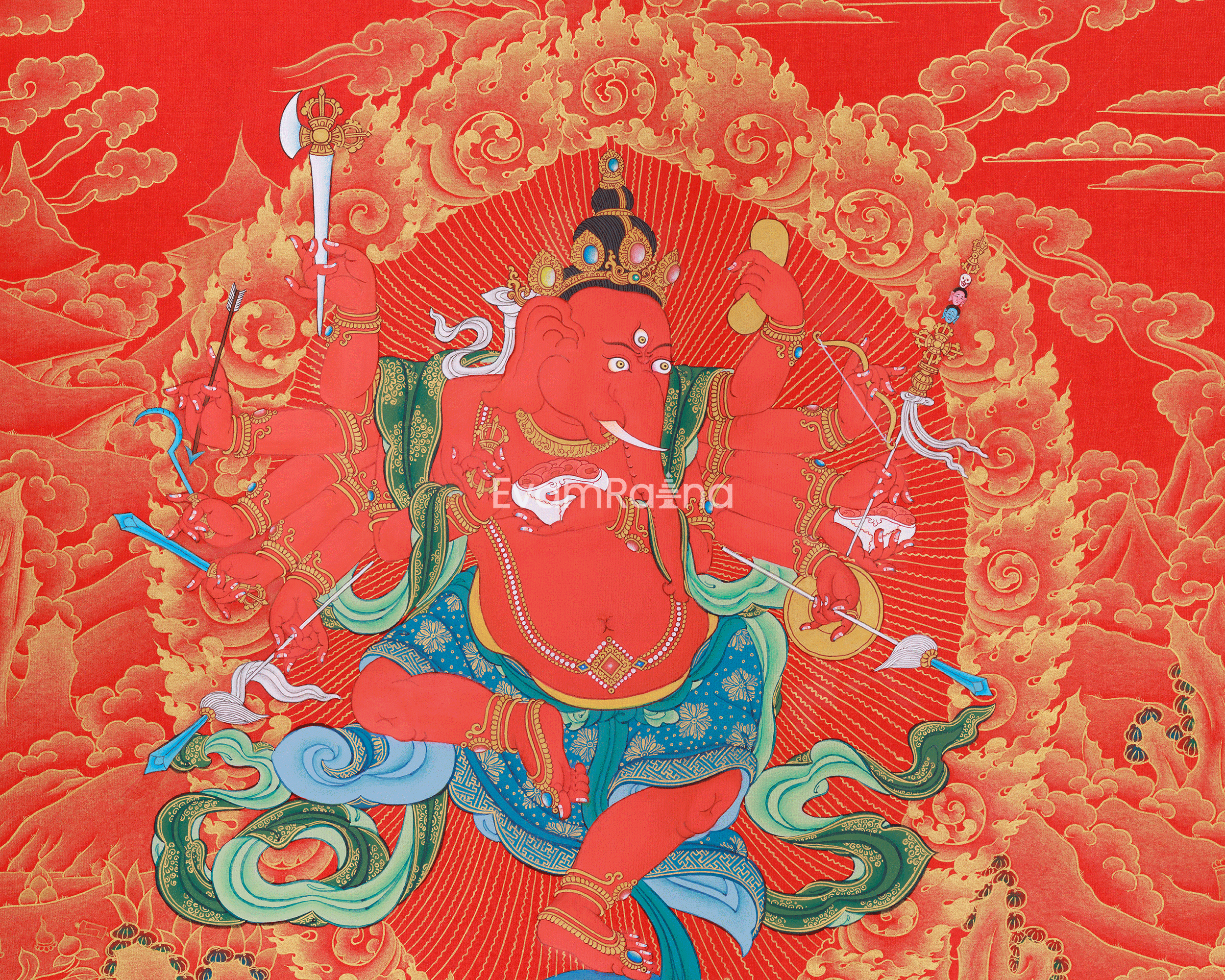 This thangka portrays Lord Ganesha, the deity associated with wisdom, prosperity, and new beginnings. Displayed in his luminous red form, he stands gracefully in a lively dance pose atop an eight-petalled lotus seat. He has multiple arms, each holding symbolic tools—axe, vajra, sword, hook, arrow, and spear—signifying his power to remove ignorance and lead devotees toward enlightenment. His calm yet commanding expression reflects a perfect balance—joyful compassion combined with strength. Ganesha’s large belly indicates his capacity to peacefully digest all life experiences—both good and bad—while his mongoose, shown below, expels jewels that symbolize boundless generosity. The golden backdrop, adorned with clouds and celestial motifs, elevates the divine beauty of this sacred piece, serving as a visual tribute to abundance, protection, and wisdom.
