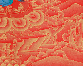 Created with devotion in our Enlightenment Studio, this Lord Ganesha Thangka is hand-painted on cotton canvas with acrylic pigments and 24K gold. It features the rare Nakthang (Gold on Red) style—an ancient Tibetan technique layering pure gold over crimson to create divine luminosity. The red symbolizes vitality and auspicious energy, while the gold highlights Ganesha’s sacred role as obstacle-remover and success-bringer. Every detail, from swirling patterns to light gradients, is rendered precisely, merging artistic brilliance with spiritual power.