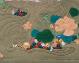 Manjushri, the Bodhisattva embodying wisdom, is honored for his role in dispelling ignorance and guiding toward enlightenment. Holding a sword in his right hand and a scripture in his left, he symbolizes wisdom that cuts through illusion and fosters accurate understanding. In this painting, he is elegantly depicted seated in a peaceful lotus posture, radiating wisdom and compassion. As an inspiring figure, this thangka reminds us of the power of wisdom to overcome challenges and move toward enlightenment, making it a meaningful addition to any space dedicated to spiritual growth.